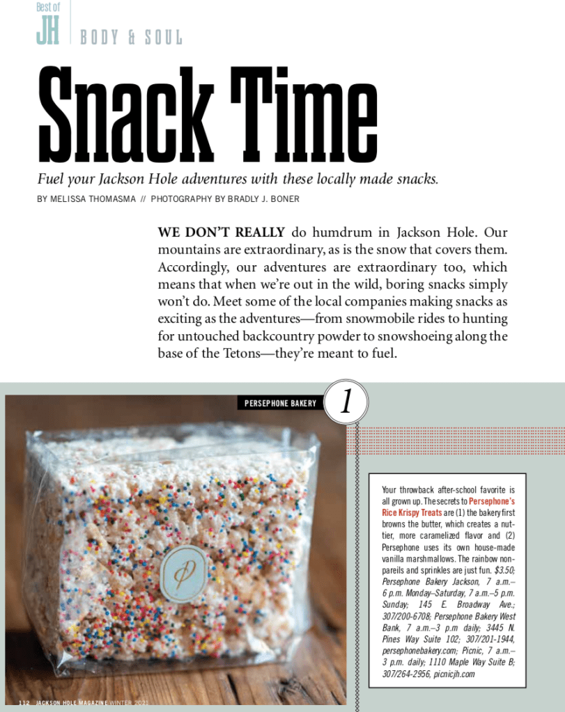 When you’re hungry, reach for one of Jackson’s top locally-crafted snacks. Salty or sweet, you wont’ regret it. Published in Jackson Hole Magazine, Winter 2020 (page 112)