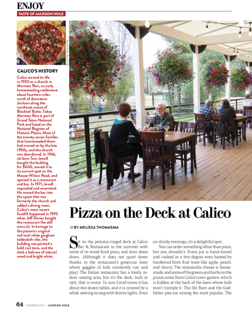 One of the valley’s most iconic eateries, Calico Pizza is a don’t-miss for a summertime evening. Published in Jackson Hole Magazine, Summer 2021 (page 64)
